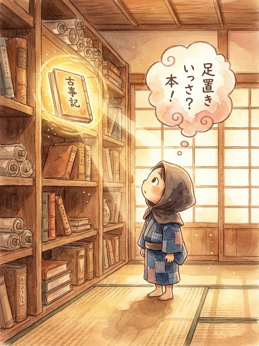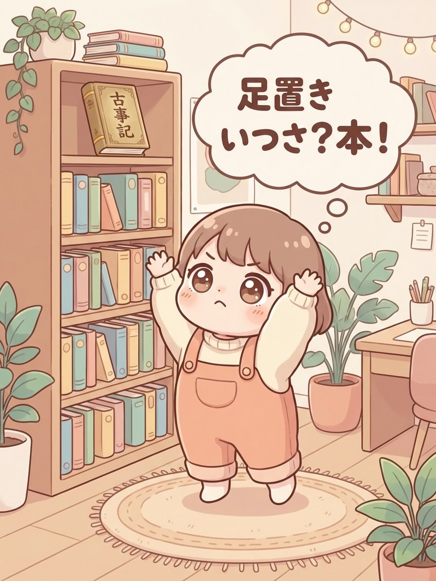 本棚の高いところに本=古事記があり、それを取り出したいけれど足置きがないと取り出せない状況を想像して、、、